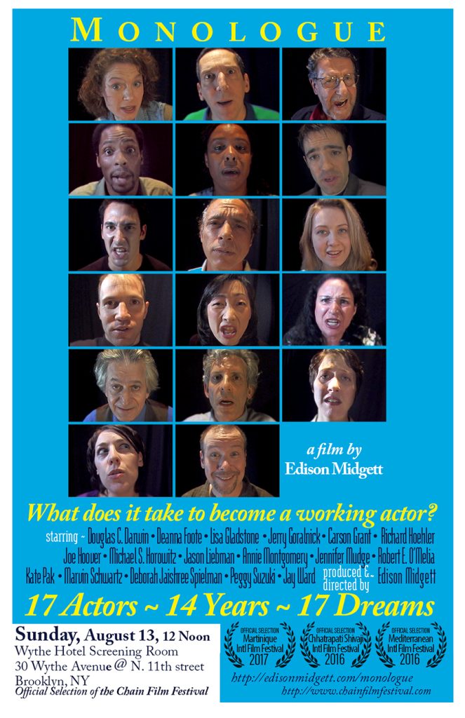 “Monologue is a documentary that looks at the lives of 17 New York City Actors over the course of 14 years to see what they have learned about the business of acting. I was interested in why artists continue in the face of so much adversity and rejection. I wanted to answer the question of why people create in the first place.”